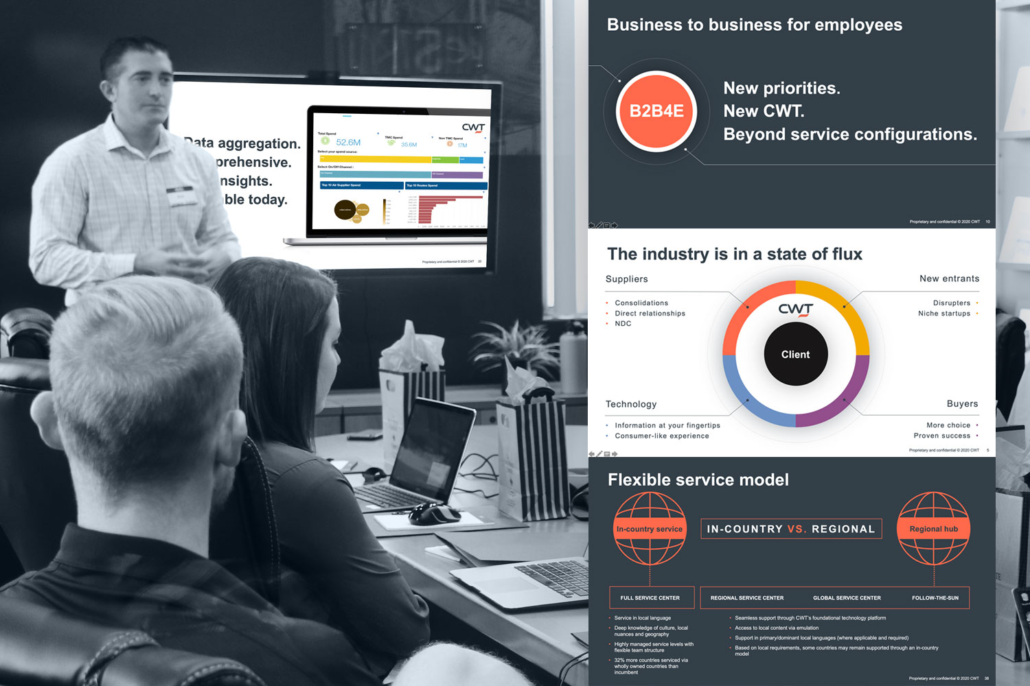 As a senior graphic designer team at CWT, I supported the sales team by designing presentation and proposal materials to win and retain clients at $45M+ travel spend. These included microsites, digital presentations, booklets, leave behinds, and more.