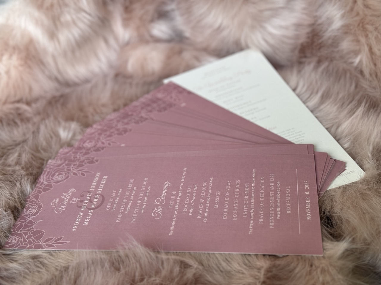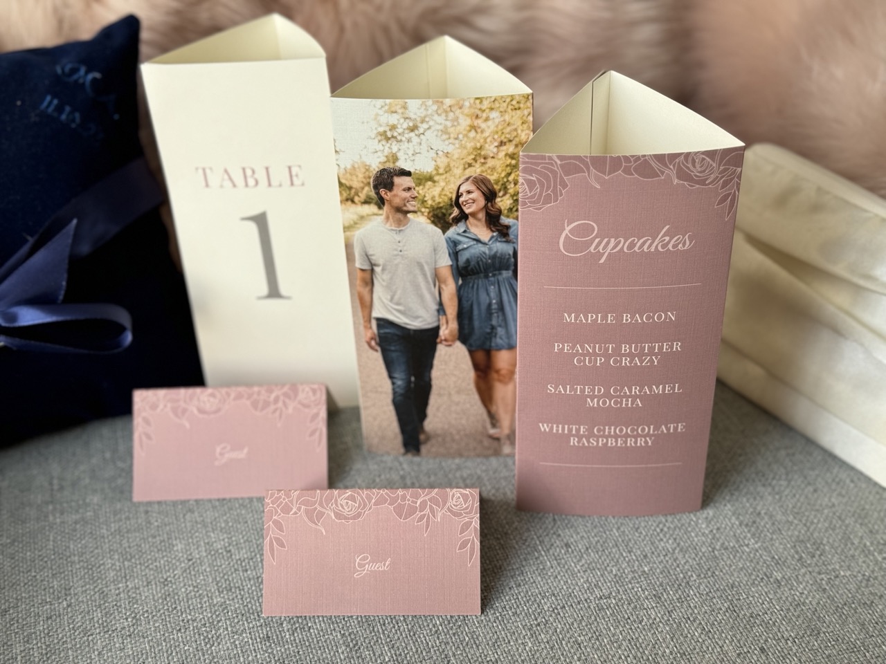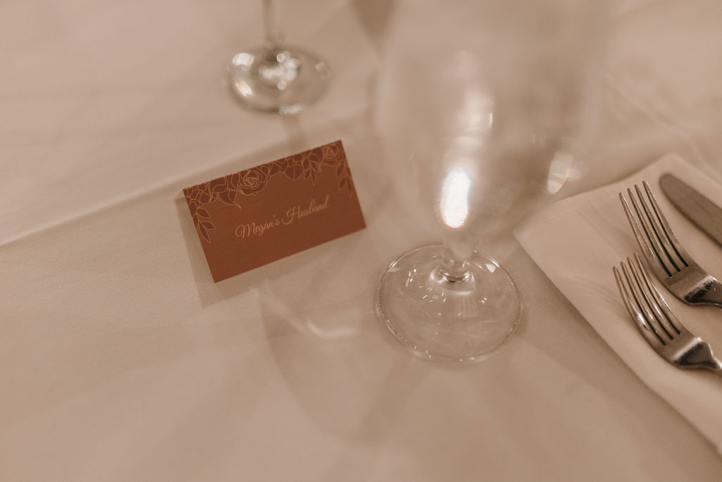 As our wedding day approached, it was time to design the invitations and collateral which included digital save the dates, web graphics, programs, place cards, and signage. I wanted the invitations to reflect the feel of the wedding dress and decor, elegant glamour with accents of desert rose, champagne, and metallics. A script paired with hand-drawn floral illustrations printed on linen paper was a perfect touch as guests opened their invitation with details of the evening timeline, an RSVP card, and an illustrated map with hotel locations. Seeing it all come together as table tents and place cards sprinkled the tables alongside flowers and candles was a special moment.